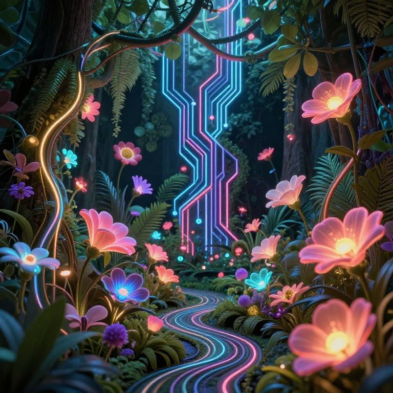 Digital art of a neon-lit forest with vibrant glowing flowers, winding blue and pink neon path, and intricate tree vines.