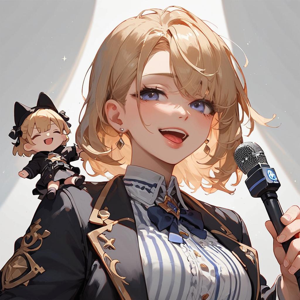 Score_9, score_8_up, score_7_up, source_anime, 1girl, IncrsNeverGonnaGiveUUp, smile, looking at viewer, microphone stand, upper body, black jacket, striped shirt, open mouth, suit, open jacket, chibi, dot eye
