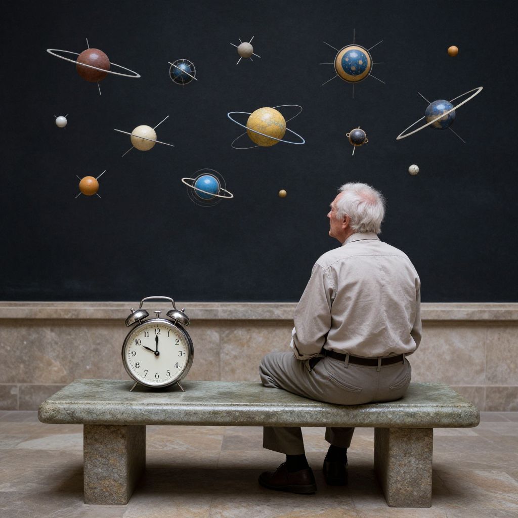 Photograph of an elderly man with white hair, seated on a stone bench, gazing at floating, colorful planets above an alarm clock. Dark background