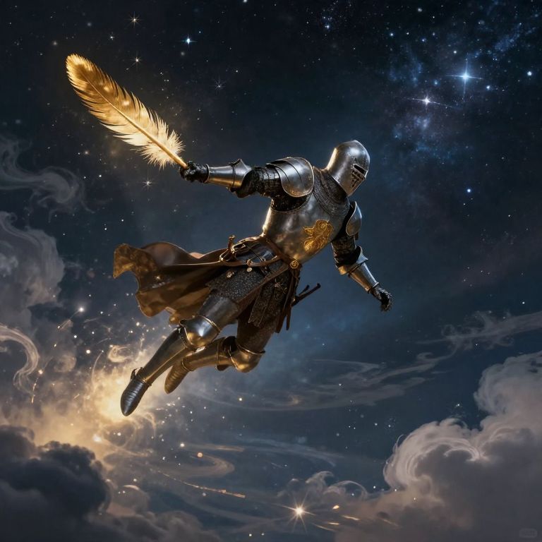 Medieval knight soaring through a cosmic expanse, propelled by a golden feather that defies gravity against a backdrop of twinkling stars and swirling clouds.