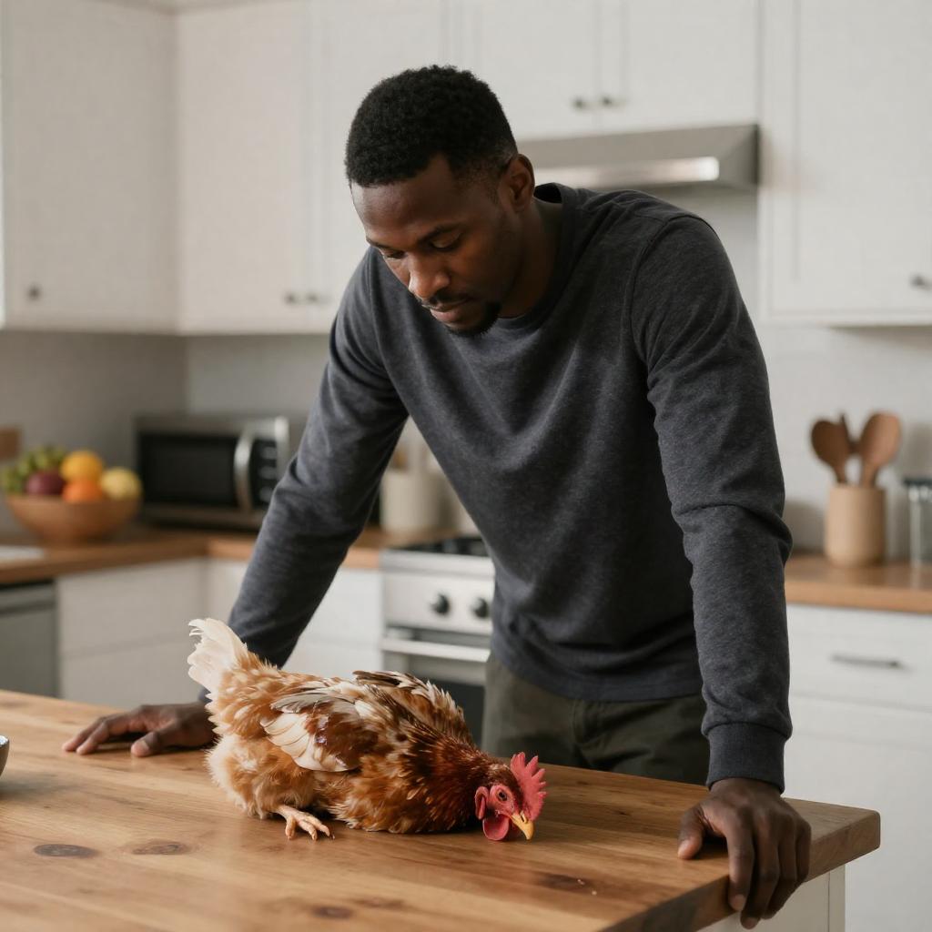 Photograph of a Black man with short hair, wearing a dark gray long-sleeve shirt, leaning over a wooden kitchen island. A dead, disheveled chicken with red comb and wings is on the island. White cabinets, microwave, and fruit bowl in the background. Man's expression is neutral.