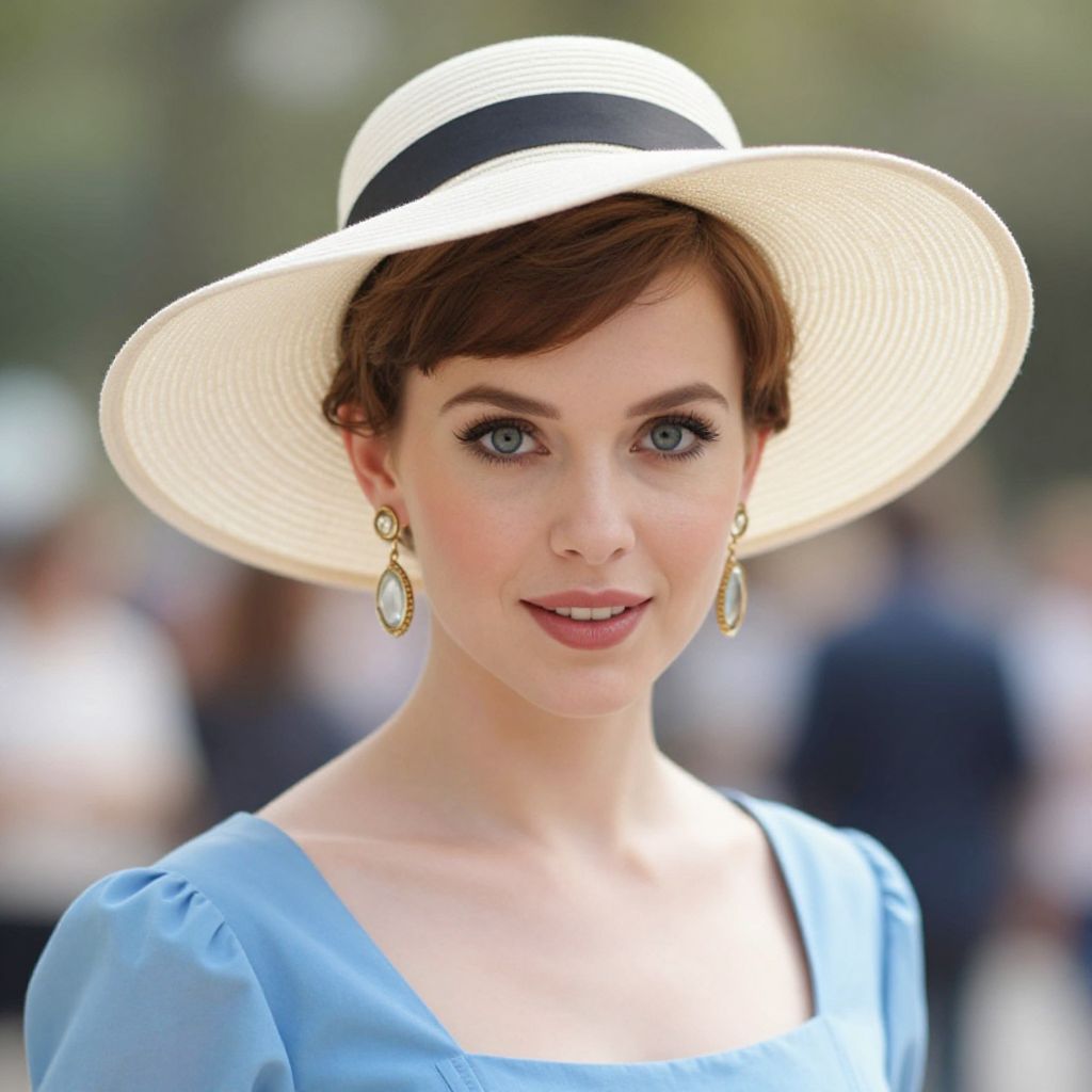 Photograph of a young woman with fair skin and short brown hair, wearing a wide-brimmed white hat with a black ribbon. She has blue eyes, subtle makeup, and gold drop earrings with white gemstones. She is dressed in a light blue, puffed-sleeve blouse with a square neckline. The background is blurred, showing indistinct figures and greenery, suggesting an outdoor setting. The image has a sharp focus on her face, highlighting her elegant and refined appearance.