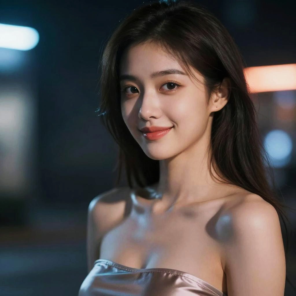 Photograph of a young Asian woman with long, straight black hair and fair skin, smiling gently at the camera. She has dark brown eyes, slightly arched eyebrows, and full, natural pink lips. Her shoulders are bare, suggesting she may be wearing a strapless top. The background is a plain, light gray wall with subtle, abstract patterns. The image has a soft, slightly digital filter effect, giving it a slightly airbrushed, polished appearance. The lighting is even, highlighting her smooth skin and delicate features.