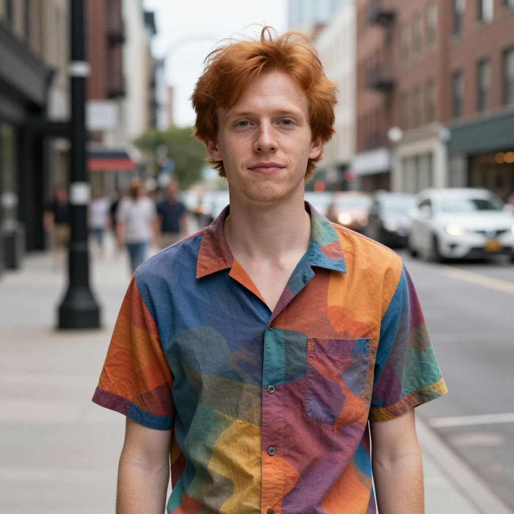 "Groovy, man with red hair and a colorful shirt on a city street"