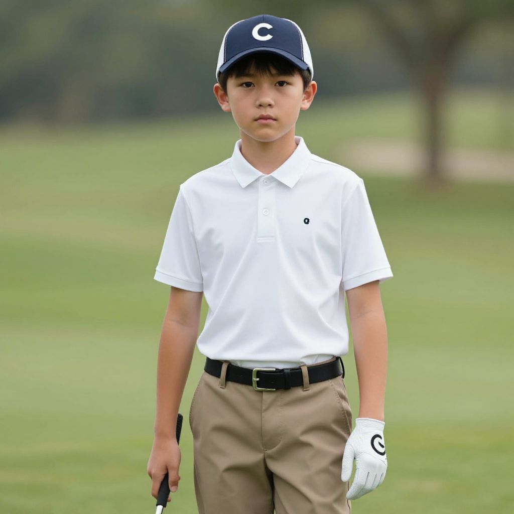 Photograph of young Asian boy in white polo, beige pants, black belt, navy cap with "C," holding golf club, wearing white glove,