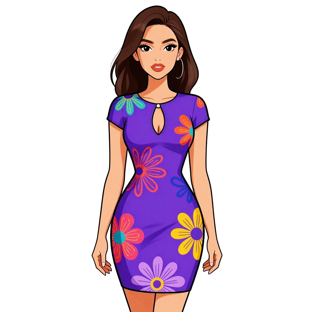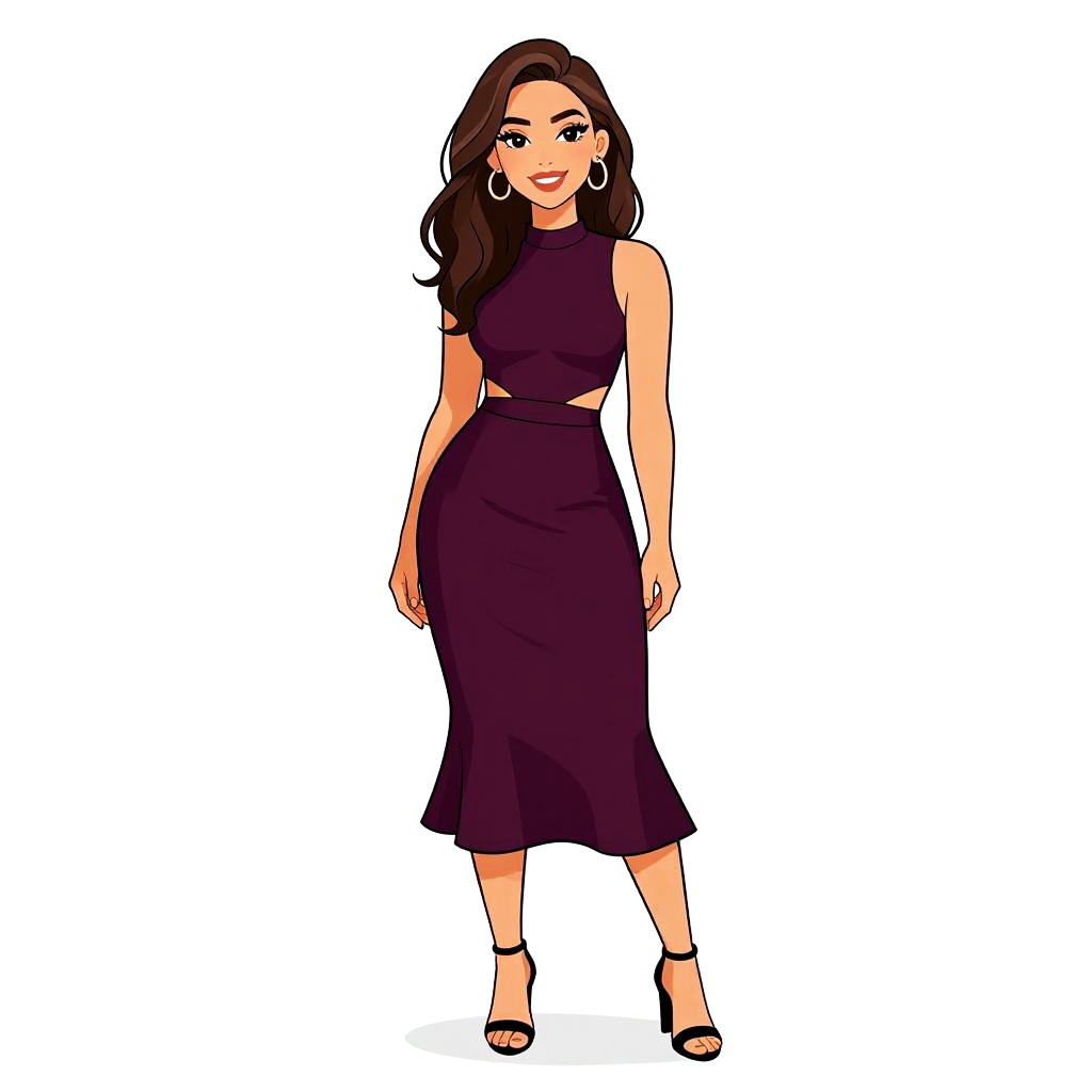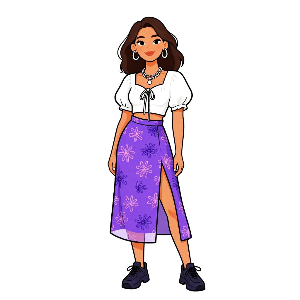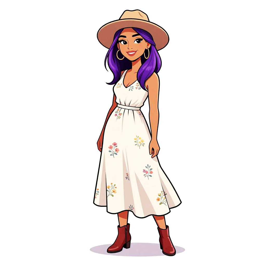 Woman with pretty face and pretty hair. Woman, boho chic, floral maxi dress in pastel shades, cold shoulder design with thin straps, sweetheart neckline, short flutter sleeves, fitted waist, full-length skirt with front slit, white background. --sref 1467