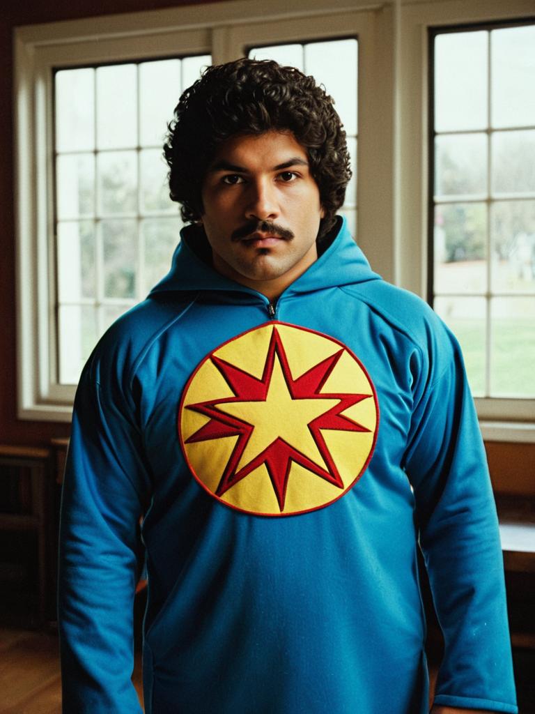 Nacho libre blue costume, solo, male focus, 1boy, looking at viewer, indoors, standing, brown hair, long sleeves, window, closed mouth, blue coat