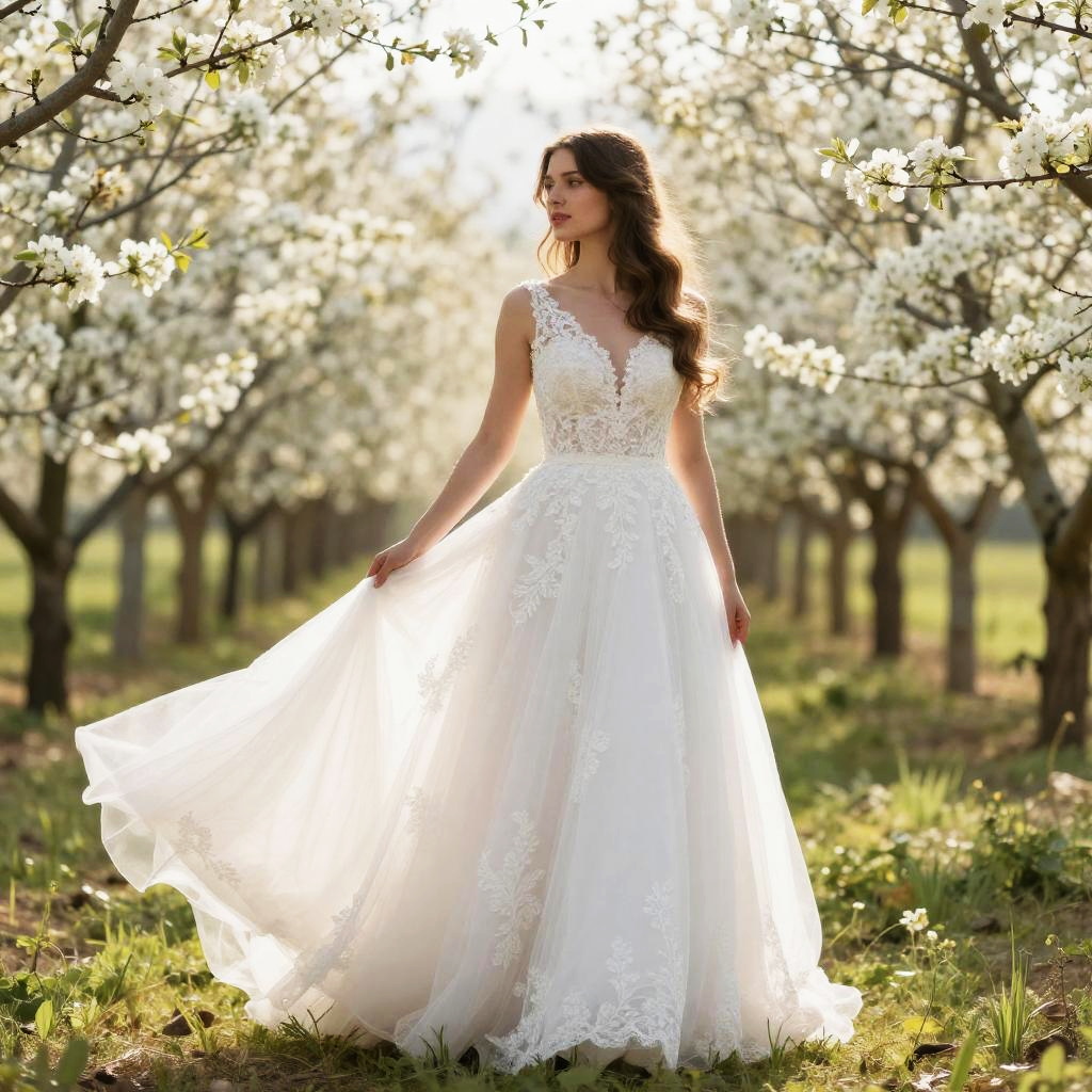Photograph of a young woman with long brown hair standing in a sunlit orchard, wearing a white, sleeveless, lace-embellished wedding dress with a fitted bodice and full skirt. She's holding out the skirt, letting it flow, and looking to the side with a serene expression. The background features blooming trees with white flowers, and the sunlight filters through, creating a dreamy, ethereal glow.