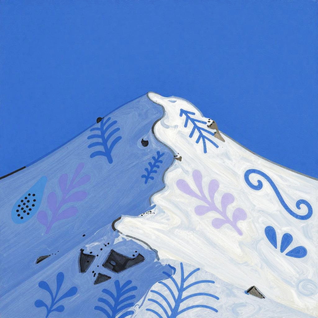 A snowy mountain peak, rendered in the style of Henri Matisse, featuring bold outlines and a flattened perspective. The scene captures crisp snow, clear blue skies, with a vibrant, cheerful palette of icy blue, white, and pale lavender, and decorative patterns inspired by nature, creating a dreamlike and harmonious atmosphere.