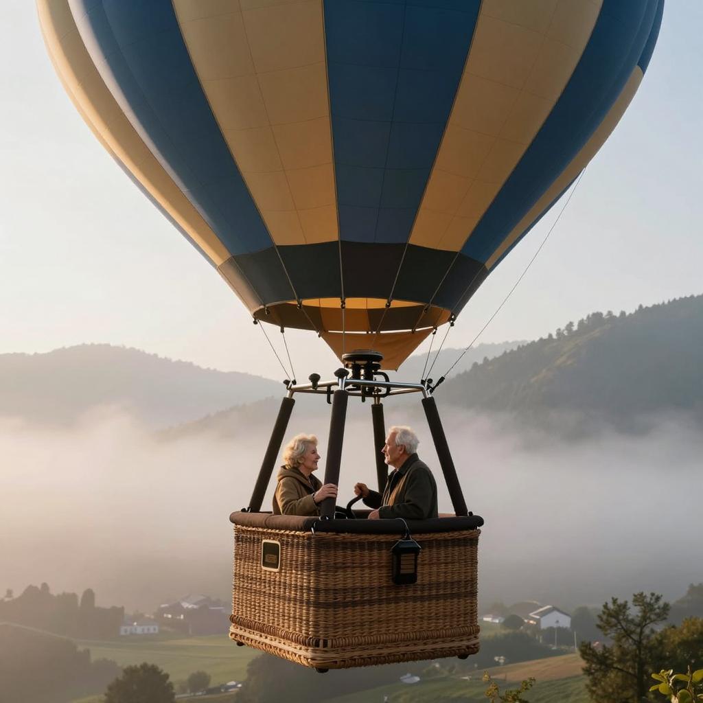 Elderly couple piloting a vintage hot air balloon through misty alpine valley at sunrise, fashion photography, glam art, cinematic drama, epic scale, exquisite detail, 30-megapixel 4K, 85 mm lens, sharp focus, f/8, ISO 100, 1/125 s shutter, diffuse back-lighting, award-winning composition.