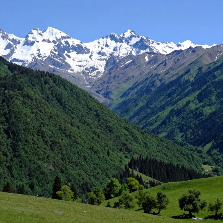 Photograph of a mountainous landscape featuring snow-capped peaks under a clear blue sky. The foreground showcases a lush green meadow with scattered trees. Mid-ground consists of a dense forest covering rolling hills. The background is dominated by towering, rugged mountains with white snow on the highest peaks. The image captures the contrast between the dark green forest and the bright white snow, highlighting the natural beauty and elevation changes in the terrain.