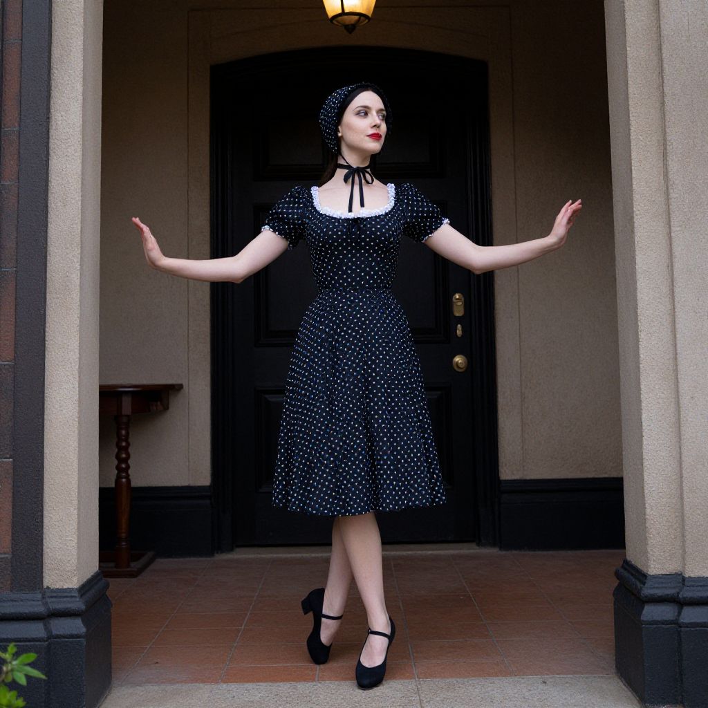 Photograph of a pale-skinned woman with red lipstick, wearing a black polka dot dress with a white collar, black headscarf, and black shoes. She stands confidently with arms outstretched in a doorway, framed by beige columns. The black door behind her has a brass handle, and a small wooden table is partially visible to the left. The floor is tiled in a reddish-brown pattern. The lighting is soft, casting gentle shadows. Her expression is poised and elegant, evoking a vintage, mid-20th-century style.