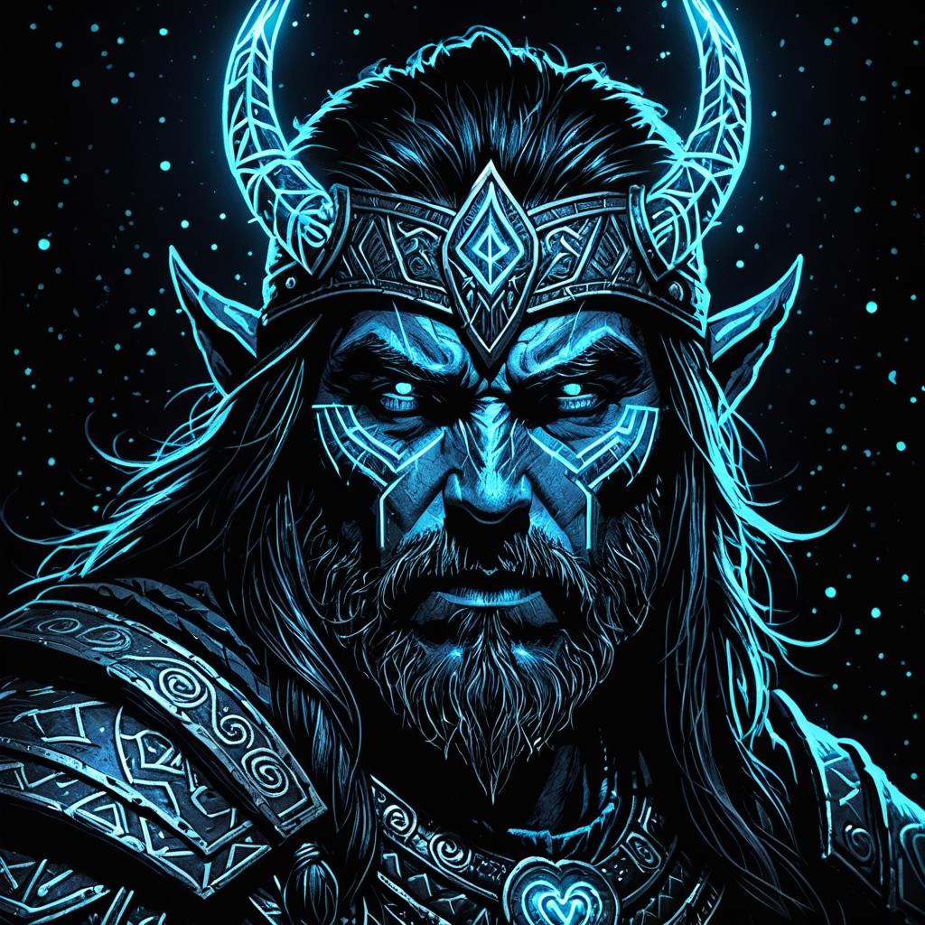 A super close-up portrait of a mystical warrior in dark fantasy style, wearing a horned helmet and intricately detailed armor adorned with glowing neon blue runes and patterns. The warrior's intense gaze is highlighted by blue glowing markings on his face, set against a dark, atmospheric background. The image features cinematic lighting and high detail, emphasizing the warrior's fierce and enigmatic presence.