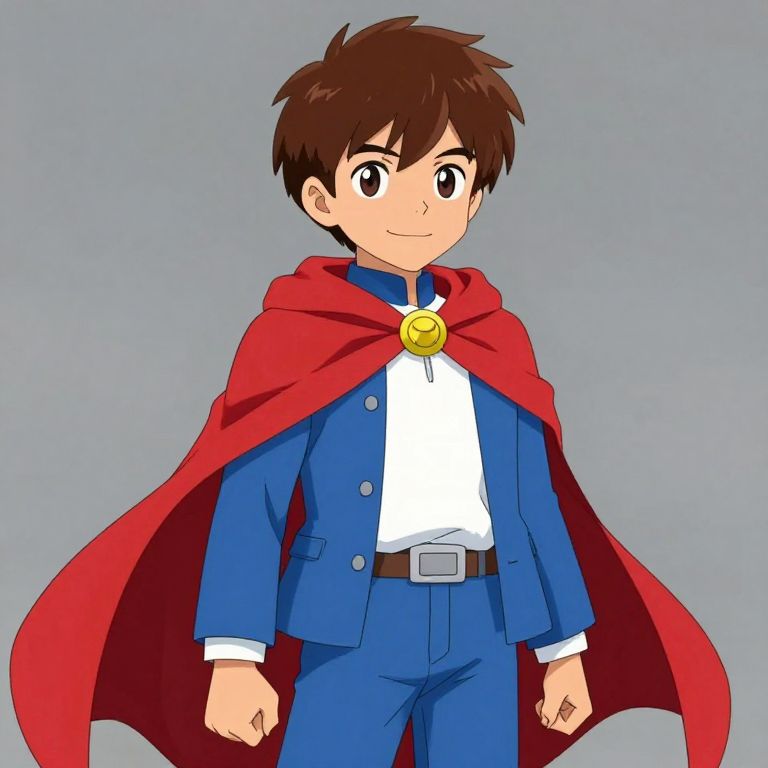 Boy with short brown hair, wearing a red cape, white shirt, blue pants, and a blue jacket.