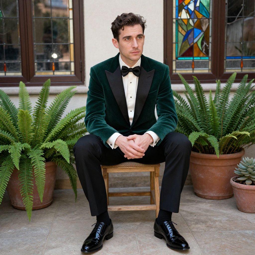 A man, emerald green velvet tuxedo, ivory satin shirt, classic black dress pants, sleek black dress shoes, black satin bow tie, charming courtyard, potted ferns and succulents, colorful stained glass windows, pinhole camera style, contemplative expression. Man has masculine face and piercing eyes