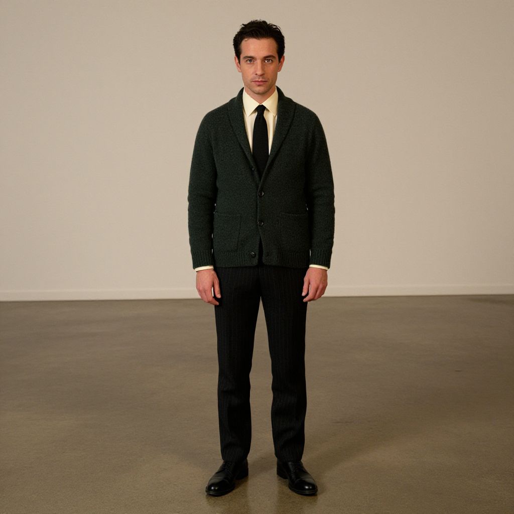 A man, charcoal pinstripe suit, ivory dress shirt, dark green merino wool cardigan, black oxford shoes, solid black tie, minimalist interior, polished concrete floors, soft ambient lighting, oversaturated film, confident expression Man has masculine face and piercing eyes