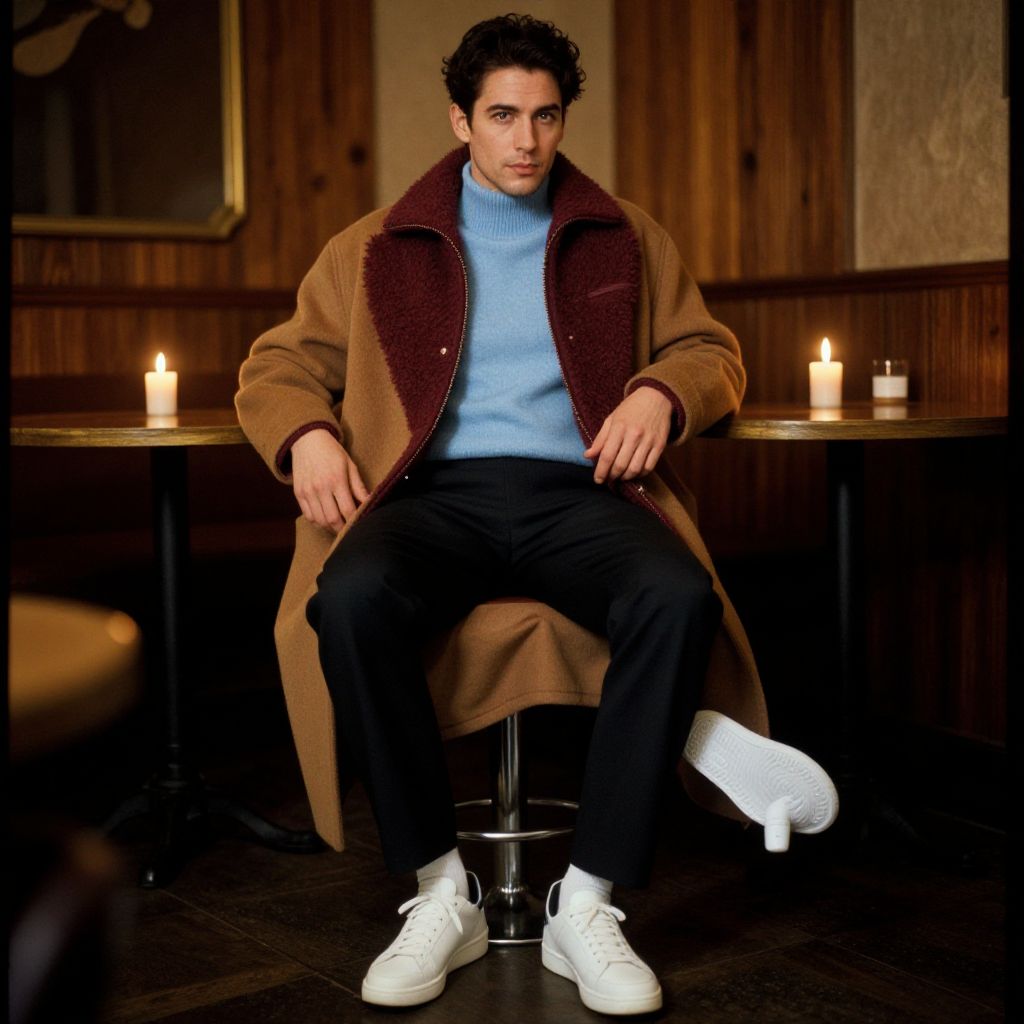 A man, burgundy fleece jacket, light blue mock neck sweater, tailored black trousers, classic white sneakers, oversized wool coat in camel, cozy bistro, warm wood accents, flickering candlelight, daguerreotype film, contemplative expression Man has masculine face and piercing eyes
