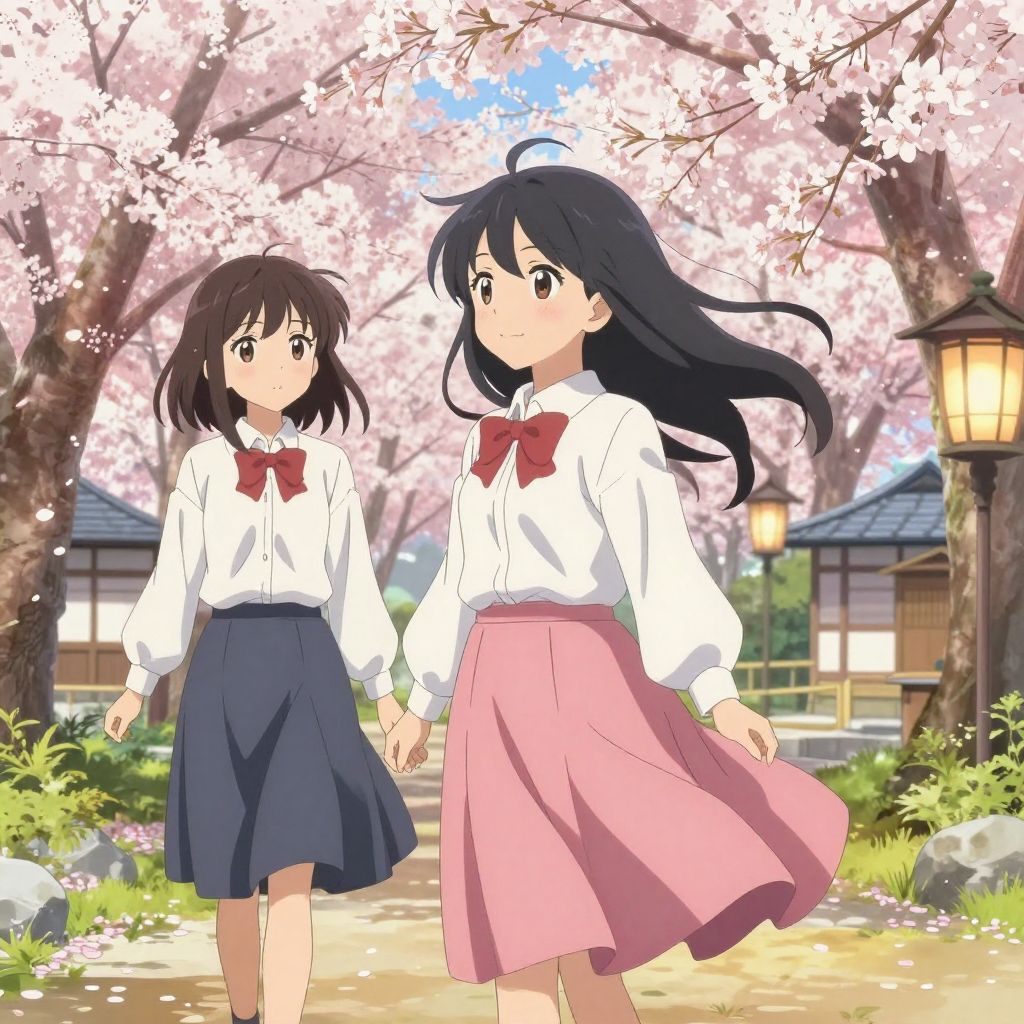 Anime-style digital illustration of two schoolgirls holding hands, walking under cherry blossoms; one in blue skirt, other in pink, both wearing white shirts