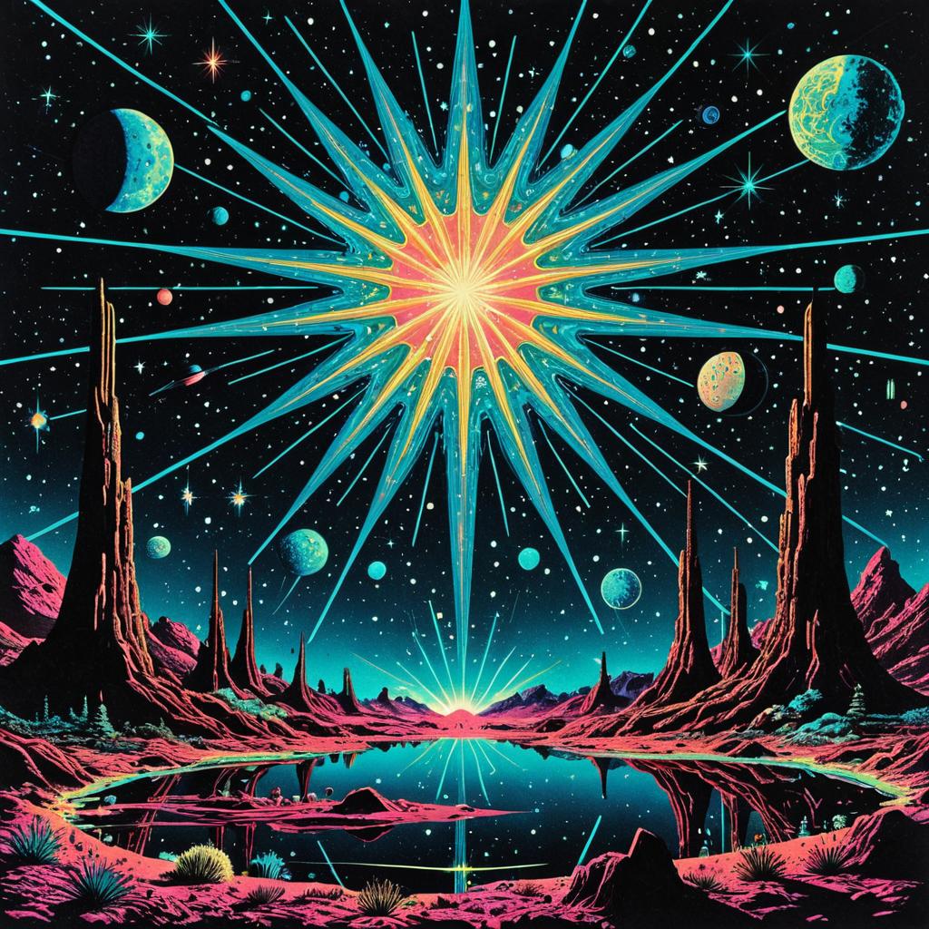 Vintage 70s psychedelic surreal sci-fi collage, trippy cosmic nebulae, fluorescent liquid patterns, surreal alien landscapes, bioluminescent aliens, floating crystalline totems, angular starburst shapes, black night sky with stars