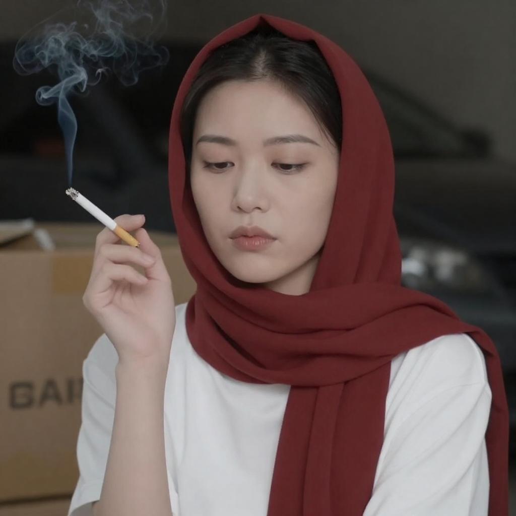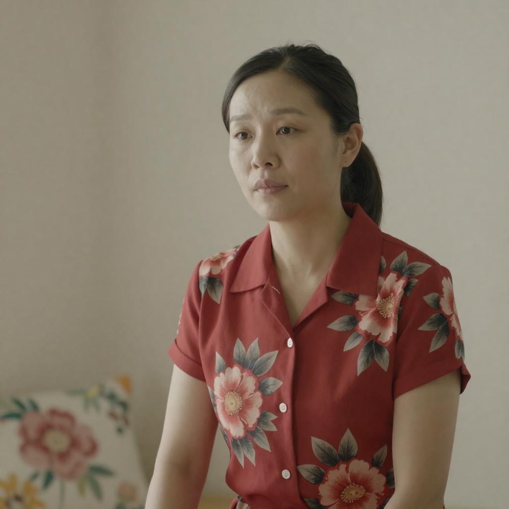 Close-up of an Asian woman with curly black hair, red jacket, and floral shirt, biting the edge of a large kitchen knife. Her eyes are downcast, expression focused. The knife is horizontal, partially in her mouth. Dim, dark background.