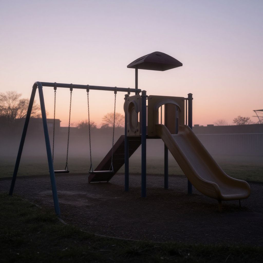 Childhood liminal space, an eerie abandoned playground at dusk with empty swings swaying in the wind, soft pastel skies blending into twilight, nostalgic yet haunting atmosphere, subtle fog surrounding old rusty slides, blending innocence and unease.
