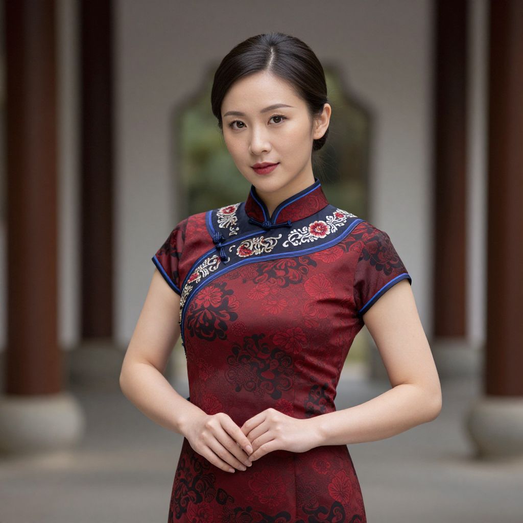 Photograph of an Asian woman with fair skin, black hair neatly tied back, wearing a traditional Chinese qipao in deep red with intricate black floral patterns and blue trim. The dress has a high collar and short sleeves. She stands with her hands gently clasped in front of her. The background features blurred architectural elements, including brown columns and a white wall, suggesting an outdoor setting in a traditional Chinese courtyard. She has a calm, slightly smiling expression. The lighting is soft, highlighting her delicate features and the rich texture of her dress.