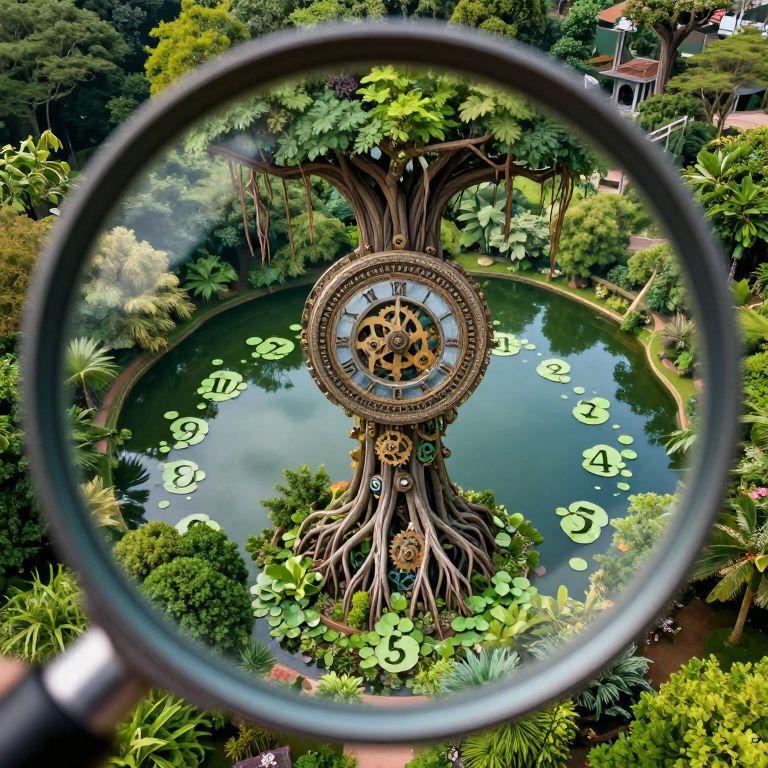From an aerial viewpoint, as if seen through a magnifying glass, envision a captivating surrealist landscape. An intricate tower arises from a verdant garden, revealing its complex gears and cogs within the structure. The clock face is replaced by a tranquil lake, mirroring the surrounding lush foliage with lily pads meticulously arranged to form numbers on an imagined timepiece. Majestic trees with roots stretching skyward create a mystical ambiance, intertwining their branches with the mechanical wonder that serves as this enigmatic sanctuary's heart, evoking a sense of timeless wonder and awe.