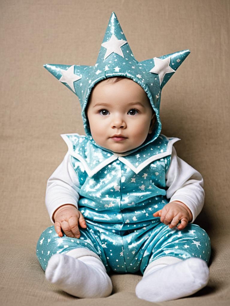 Infant in Baby Star Costume, festival baby cosplay portrait, photorealistic realism