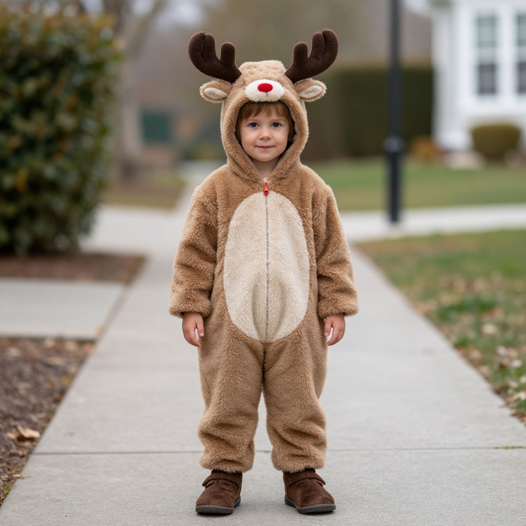 Photograph of a young boy standing on a sidewalk, wearing a brown reindeer onesie with antlers and a white chest, brown shoes, in