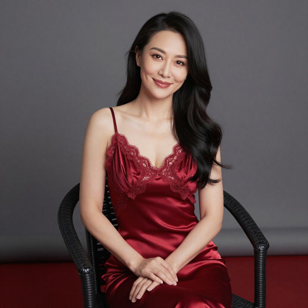 Photograph of a woman with long, wavy brown hair standing in front of a red, velvety curtain. She wears a one-shoulder, black sequined dress that reflects light. The background is dark, highlighting the red curtain and her sequined outfit. She stands with a slight, confident smile, her right hand resting on her hip.