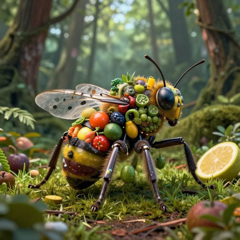 Connection fruits and vegetable fusion insects bot shell in forest, by Beeple and Arsham trending on artstation, unreal engine, matte, very fine detail, rendered in Octane hyper detailed,