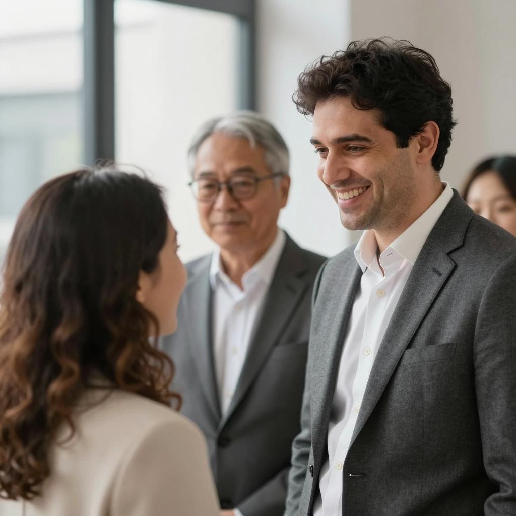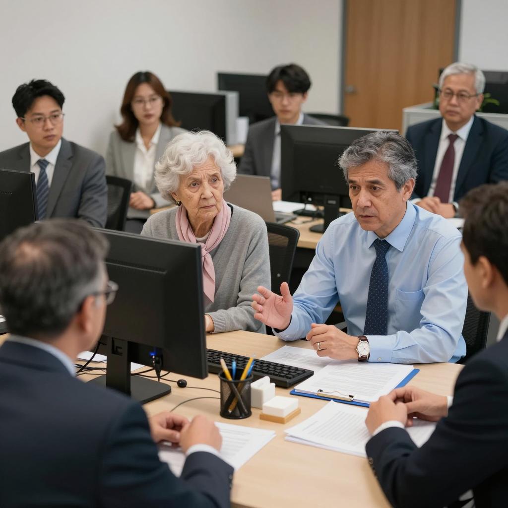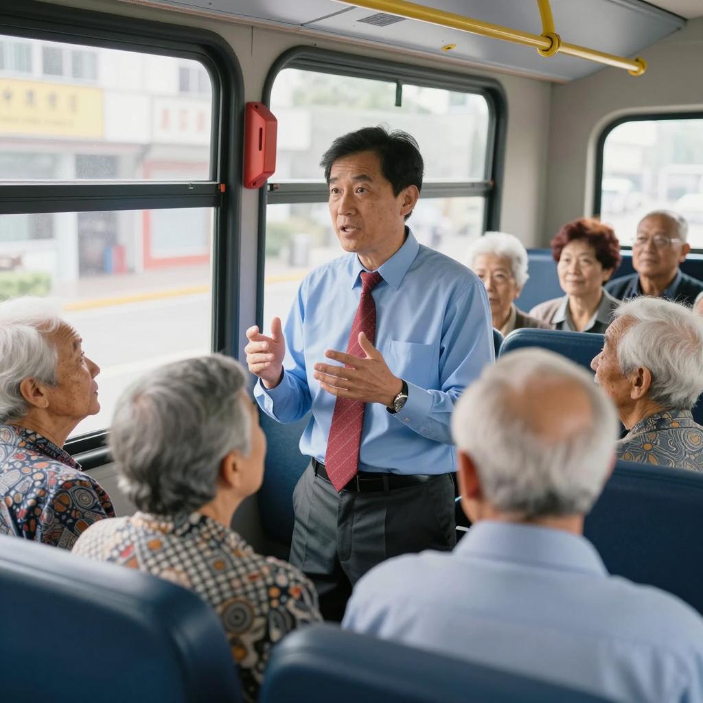 Photo of a diverse crowd gathered outdoors in winter clothing, clapping and smiling. The image features a middle-aged man with glasses, a brown beanie, and a gray coat, smiling. An elderly woman with short curly gray hair and a blue coat is laughing. The man on the right has a mustache and wears a blue jacket, also clapping. The group appears happy and energetic under overcast lighting.