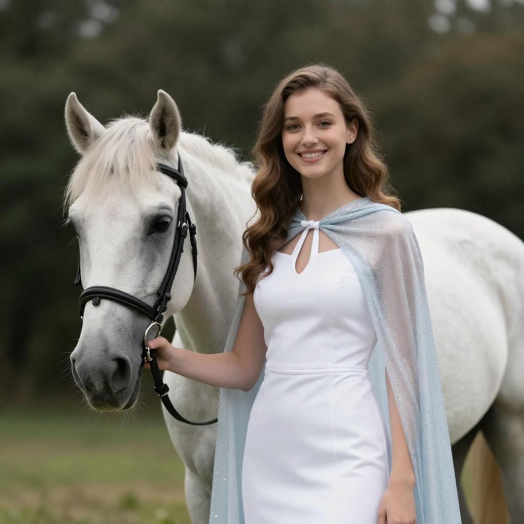 Photograph of a young woman with long blonde hair, wearing a gray sleeveless top and denim shorts, riding a white unicorn with a dark brown horn. She sits confidently, holding the reins, with a forested background blurred in deep green hues. Her expression is focused, and her legs are slightly apart, showing her gray sneakers.