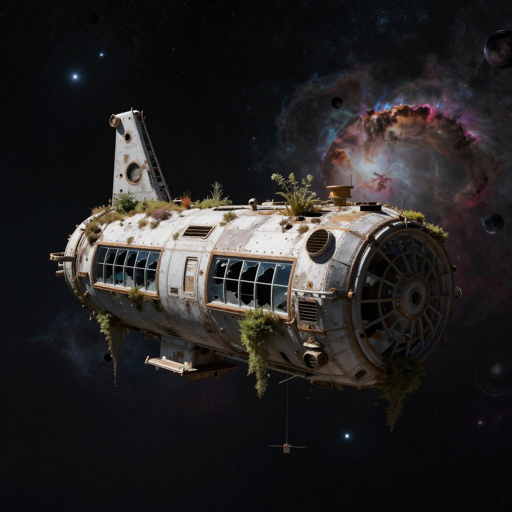 Abandoned space station drifting in deep space, eerie silence, overgrown with alien vegetation, broken glass windows, cosmic nebula background, high detail, hyper-realistic