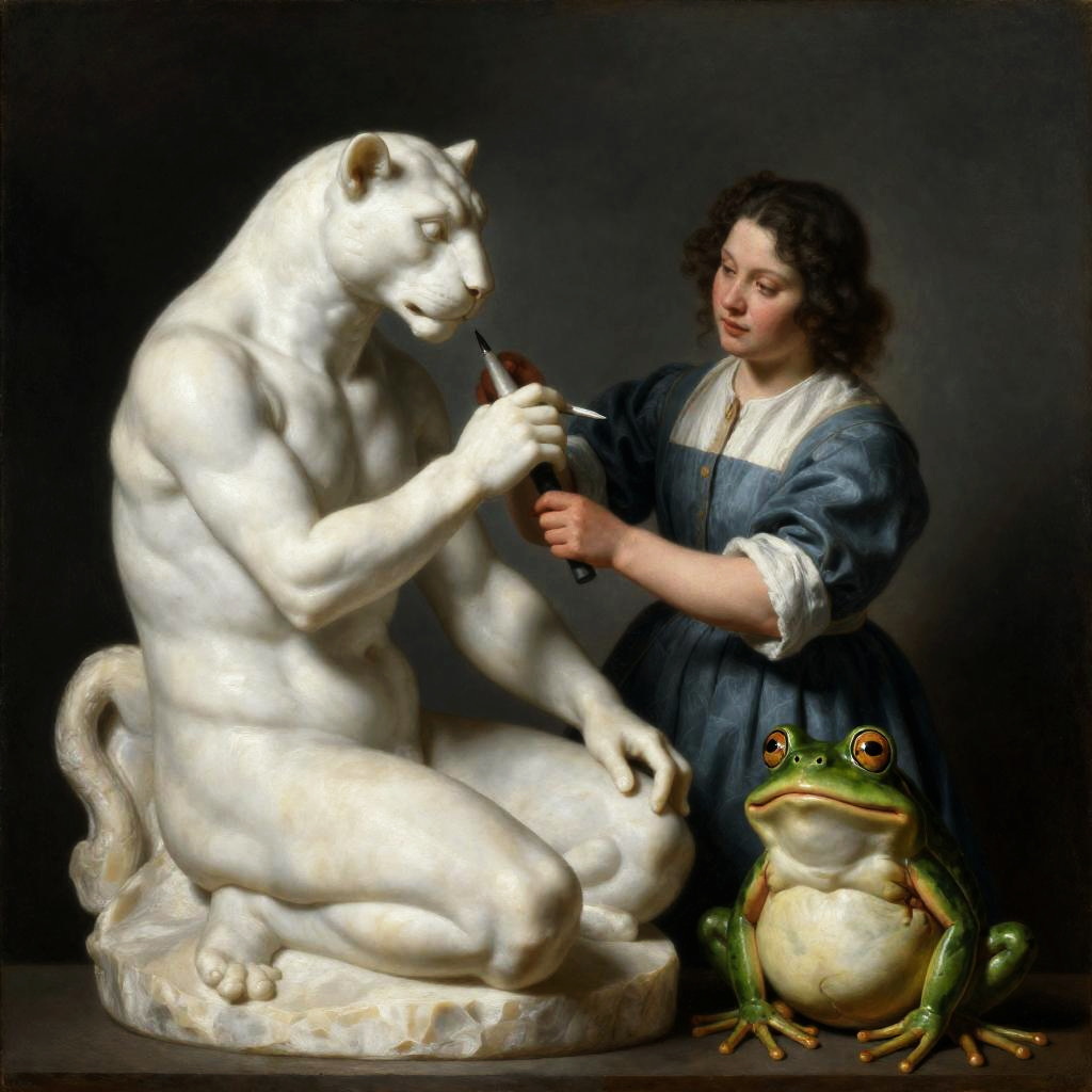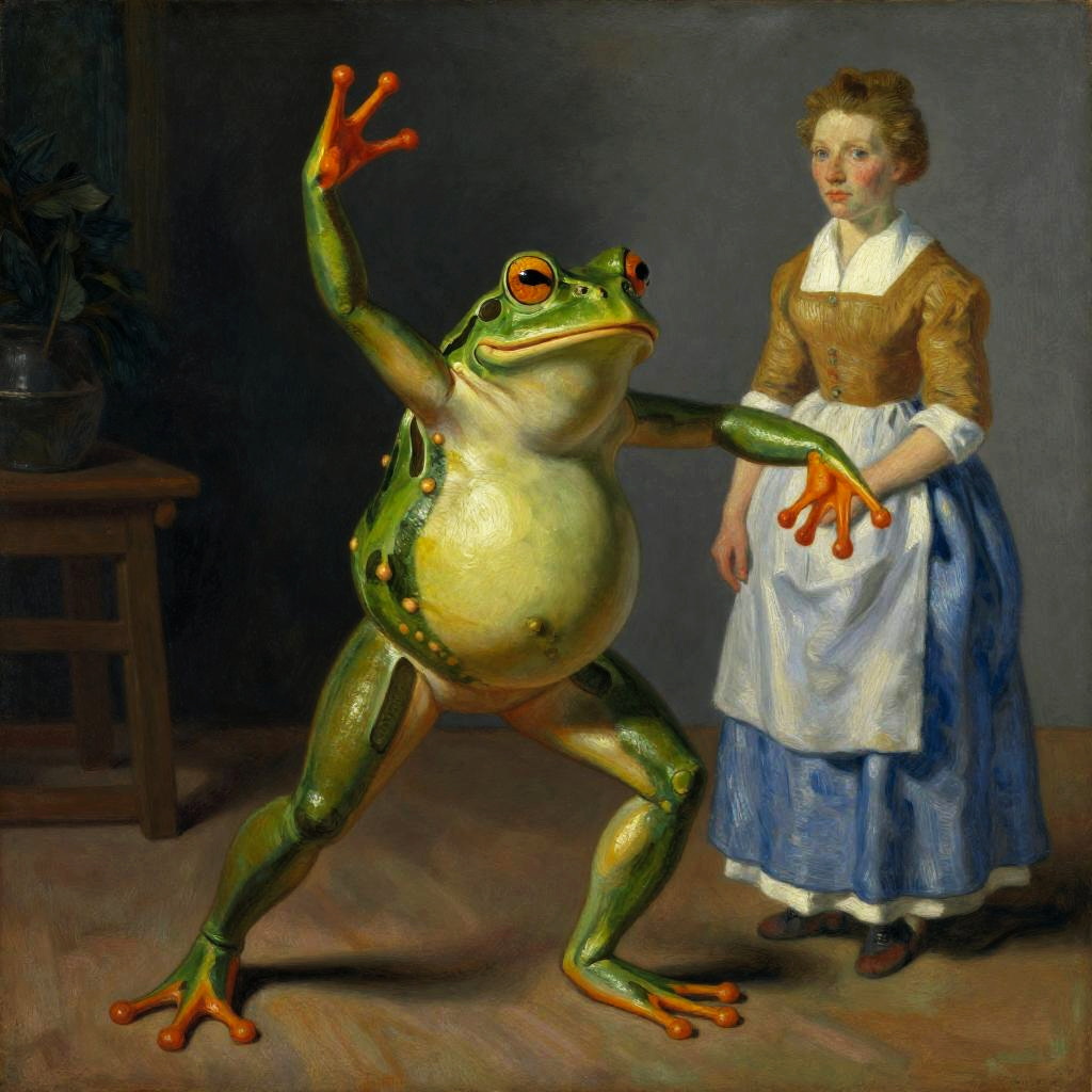 Sunflower as a gardener planting roses in a royal garden, by Jan Brueghel the Elder, the milkmaid, Sunflower, fat happy frog, green frog, dramatic lighting, northern netherlands school of art, 1660, oil on canvas