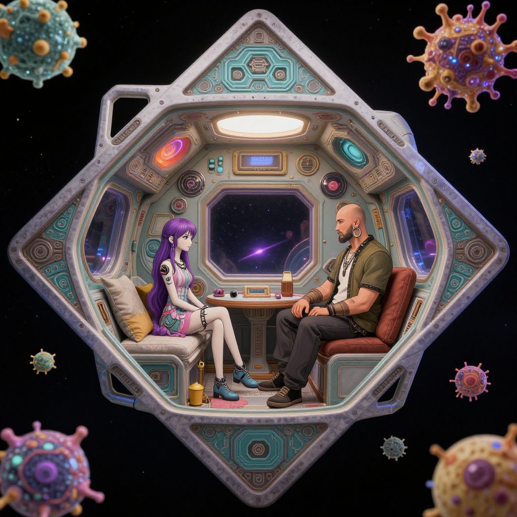 A digital illustration depicts a futuristic, hexagonal spaceship cabin with a starry window. Inside, a pale-skinned woman with long purple hair, wearing a white dress and blue heels, sits on the left, holding a book. Opposite her, a bald, muscular, dark-skinned man with a beard, dressed in a black shirt and dark pants, sits on the right. The cabin's interior features colorful, circular control panels and a small table with a lamp. Outside, colorful, spherical space objects float against a black, starry background. The style is vibrant and detailed, with a mix of sci-fi and anime influences.