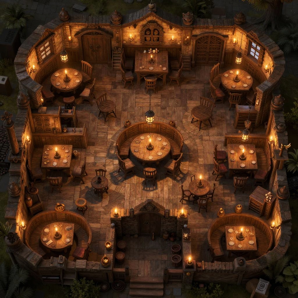 Dnd large tavern map cozy fantasy gathering place, expansive space with multiple rooms including main hall, private booths and cellar, authentic medieval furniture, flickering candles and hanging lanterns, detailed textures and rustic atmosphere, designed for tabletop RPG visualization