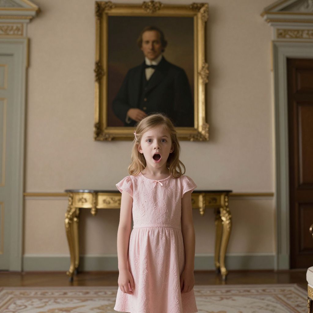 Photograph of a young girl with light brown hair, wearing a pink, short-sleeved dress, standing in a grand room. She has an open-mouthed, surprised expression. Behind her is a large, framed portrait of an older man in a black suit with a white shirt and tie, hung on a cream-colored wall. The portrait is in a gilded frame. Below the portrait is a gold, ornately designed console table. The room features light green and gold decorative moldings, and a patterned carpet is partially visible on the wooden floor. The lighting is natural, enhancing the room's elegant ambiance.
