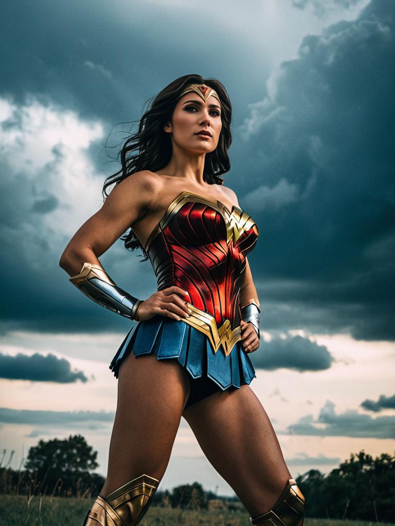 Woman in Wonder Woman Costume, photorealistic outdoor portrait with dramatic sky