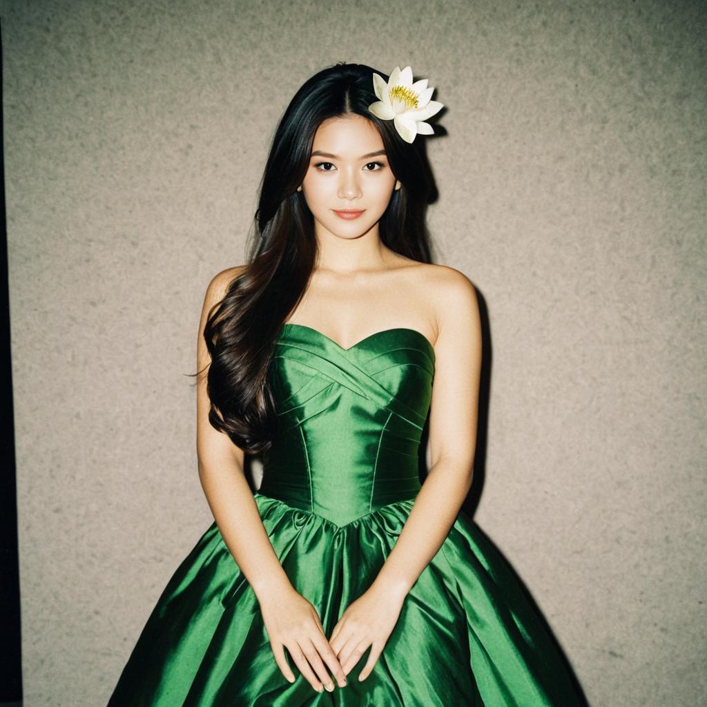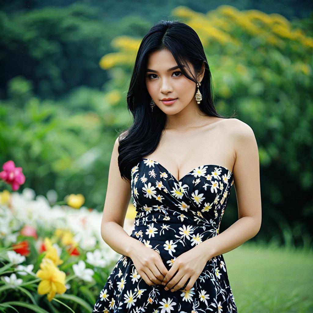 Akaza costume,1girl, solo, long hair, realistic, black hair, hair ornament, looking at viewer, dress, blurry background, blurry, flower, hair flower, photorealistic, lips, multicolored clothes