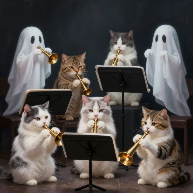 Photograph of six fluffy kittens, each playing a golden brass trumpet, arranged in a semi-circle on black music stands against a dark background. Two translucent white ghost figures with simple black eyes and mouths stand behind the kittens, adding a whimsical touch. The kittens have varied fur patterns, including white, gray, and brown tabby. Their expressions are serious and focused, contrasting with the playful, spooky ambiance created by the ghost figures. The lighting highlights the kittens and their trumpets, casting subtle shadows on the dark background.