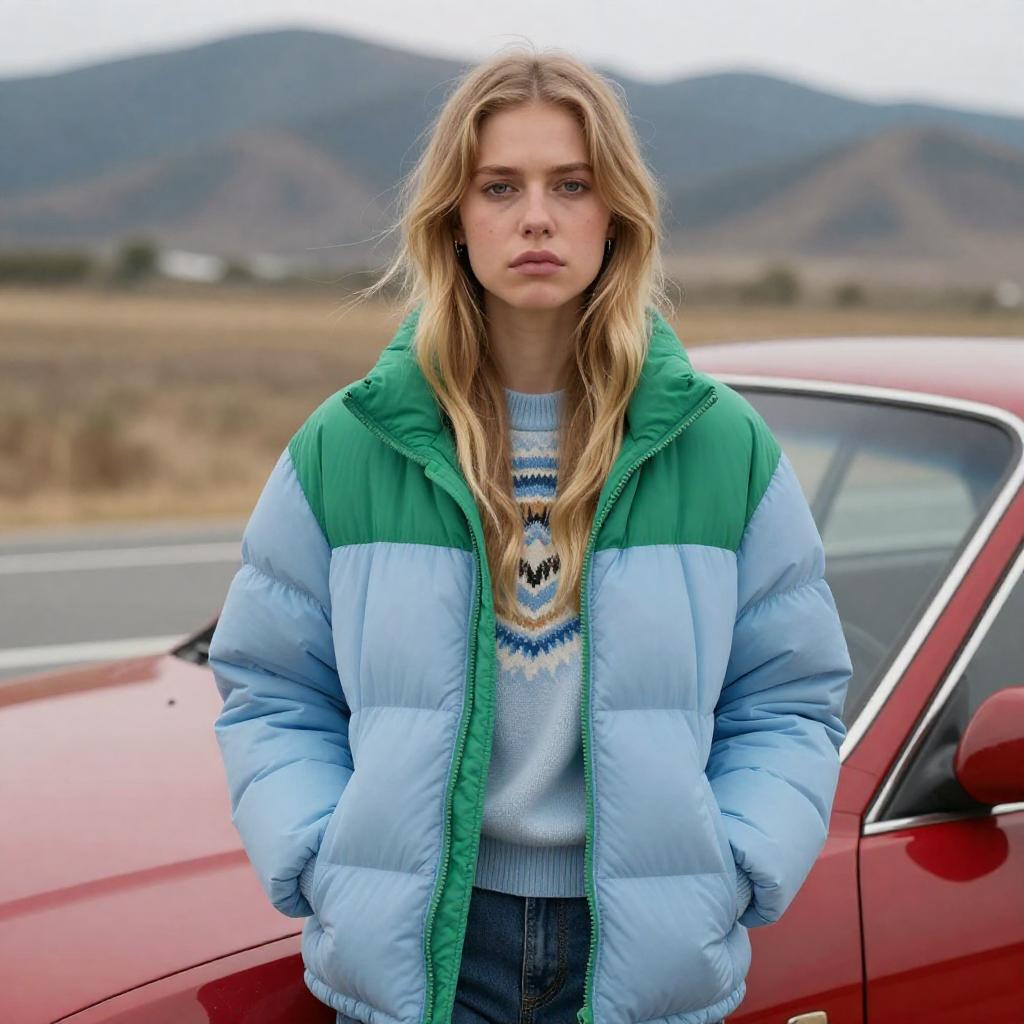 Photograph of a blonde woman with her arms crossed, leaning against a yellow vintage car with a red stripe. She wears a blue hoodie and black pants, standing outside a modern building with vertical panels. The car's window is open. Her expression is neutral. The car's side mirror reflects part of the building.