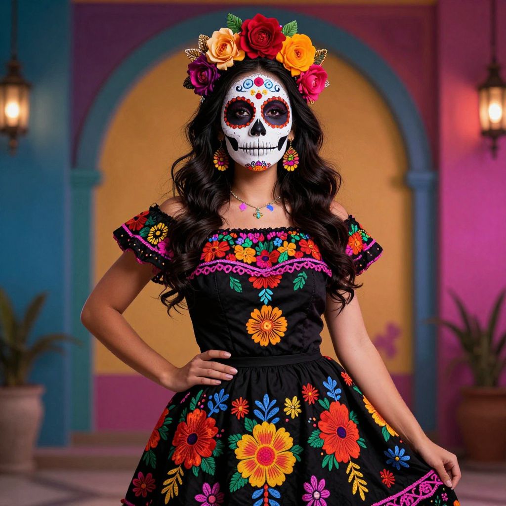Photograph of a woman with a sugar skull face, wearing a colorful floral dress, flower crown, and ornate jewelry, standing in a vibrant,