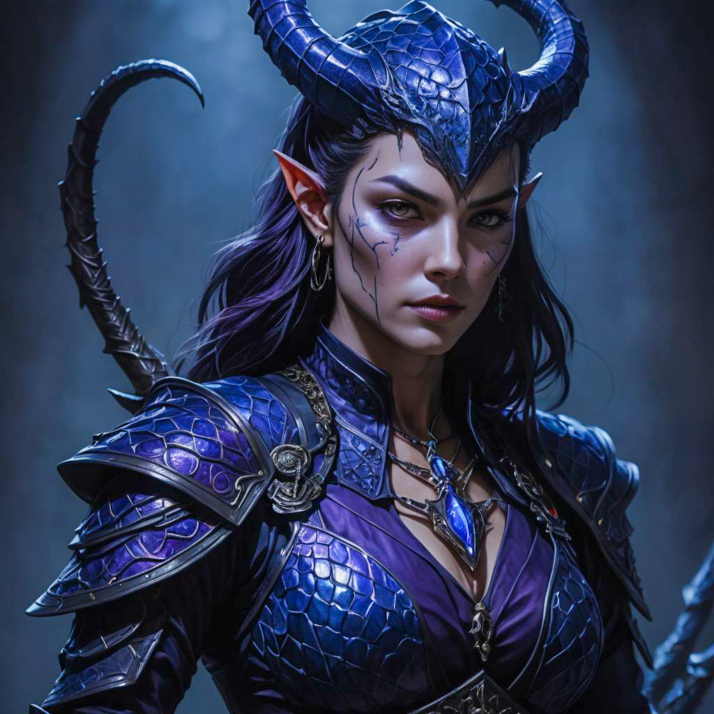 Rogue Assassin, tiefling race, half demon half human, female, DnD 5e, dark purple and blue scales, obsidian dagger, detailed scales, mythical fantasy, highres, intense gaze, sinister aura, magical enchanted spear, fantasy, detailed facial features, dramatic lighting, fantasy art, snake-like scales, mystical,