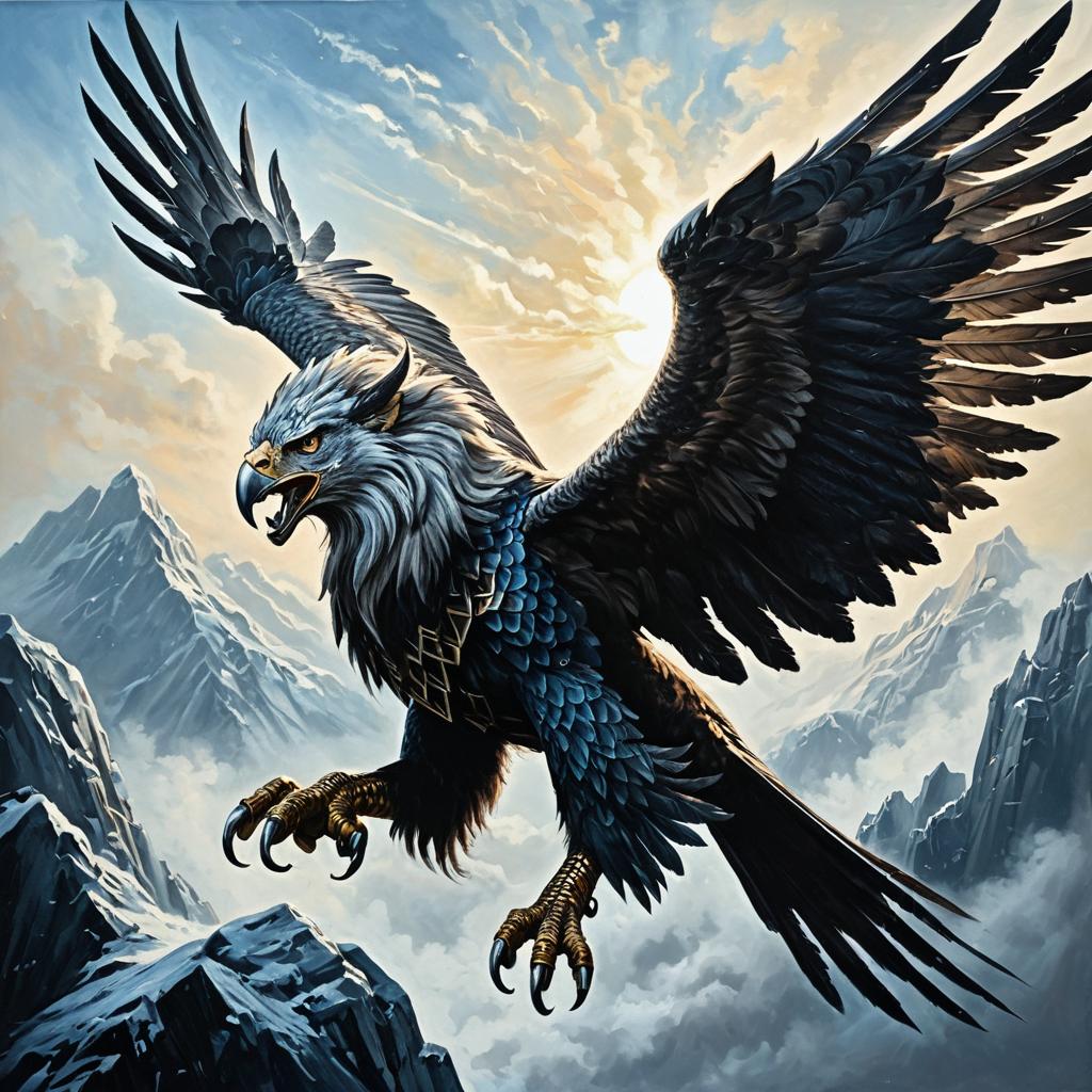 Warhammer fantasy RPG style oil painting of majestic griffon flying in sky, lion body with eagle head, cold steel blue and soft pewter hues, crisp morning haze with subtle backlighting, rich and textured oil painting