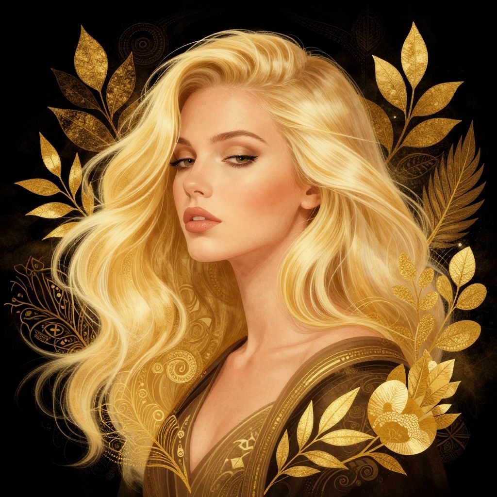 This striking illustration features a woman with flowing blonde hair, exuding an ethereal beauty. Surrounded by golden leaves and intricate patterns, her serene expression invites contemplation, blending natural elements with a modern artistic style.