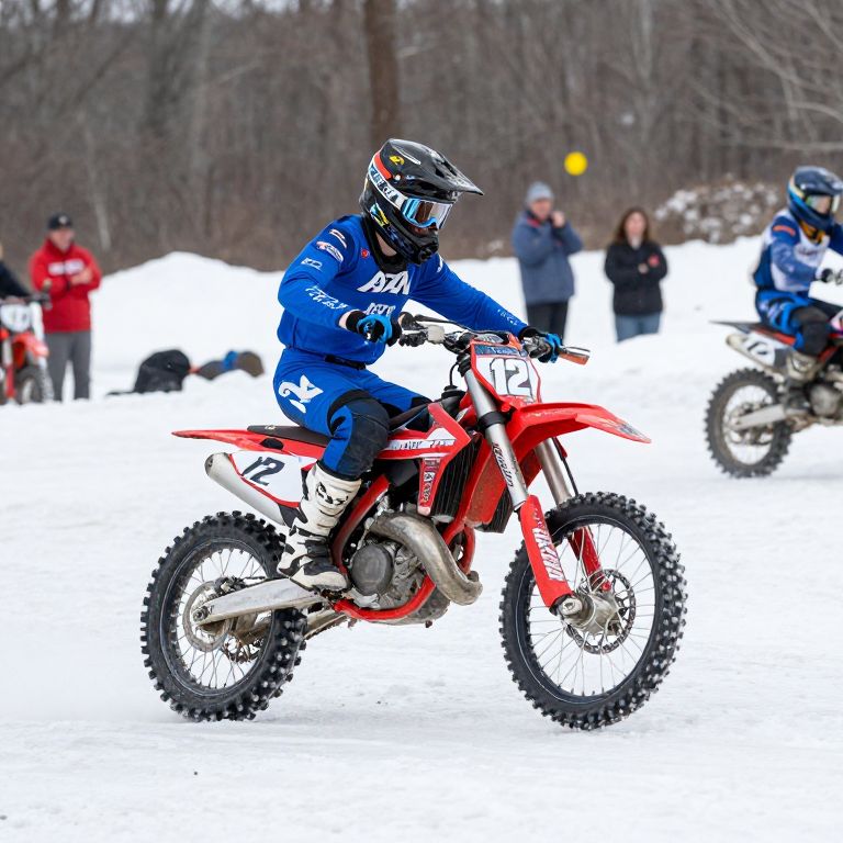 Competitor numbered 12 skillfully maneuvers a red dirt bike on icy terrain during the 2015 AMA Ice Race Grand Championship at Lake Koshkonong, with spectators and other racers visible in the snowy background.