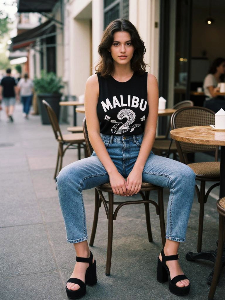 A woman in casual summer attire, wearing a sleeveless black graphic tank top with MALIBU print, high-waisted acid wash skinny jeans, and open-toe black platform sandals, captured in the visual style of kodacolor analog film, sitting at a sidewalk café in a charming old town. Sexy. Pretty face and beаutiful eyes. Big breasts