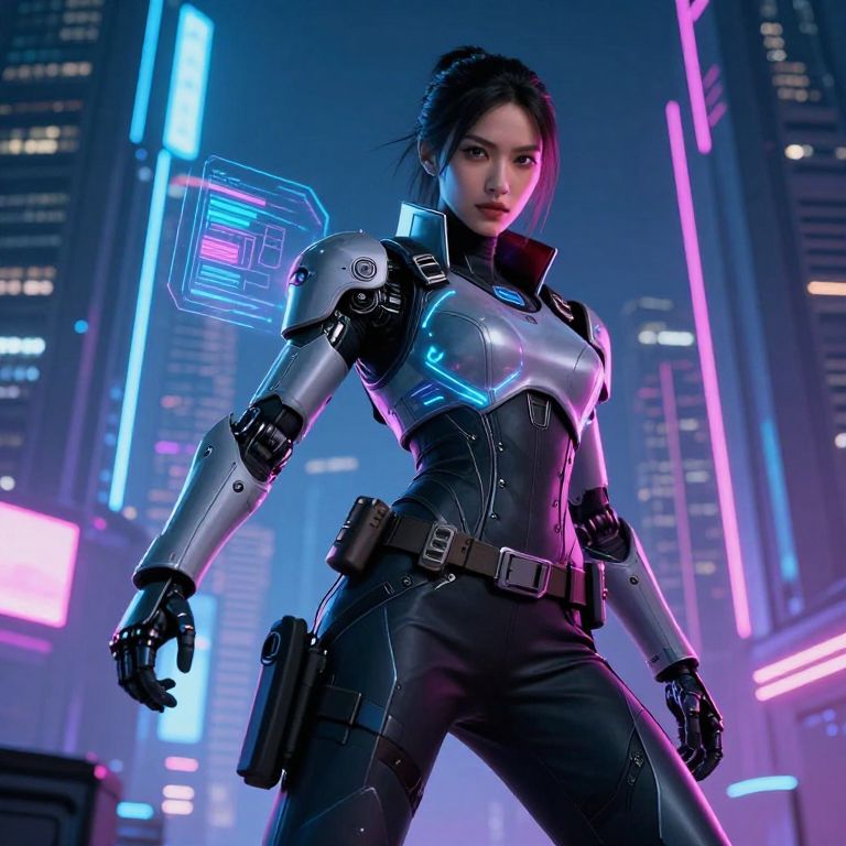 Cybill, a cybernetic warrior standing atop a dystopian skyscraper, wearing augmented reality goggles and advanced exoskeleton gear, with a digital skyline glowing vibrantly behind her in the twilight