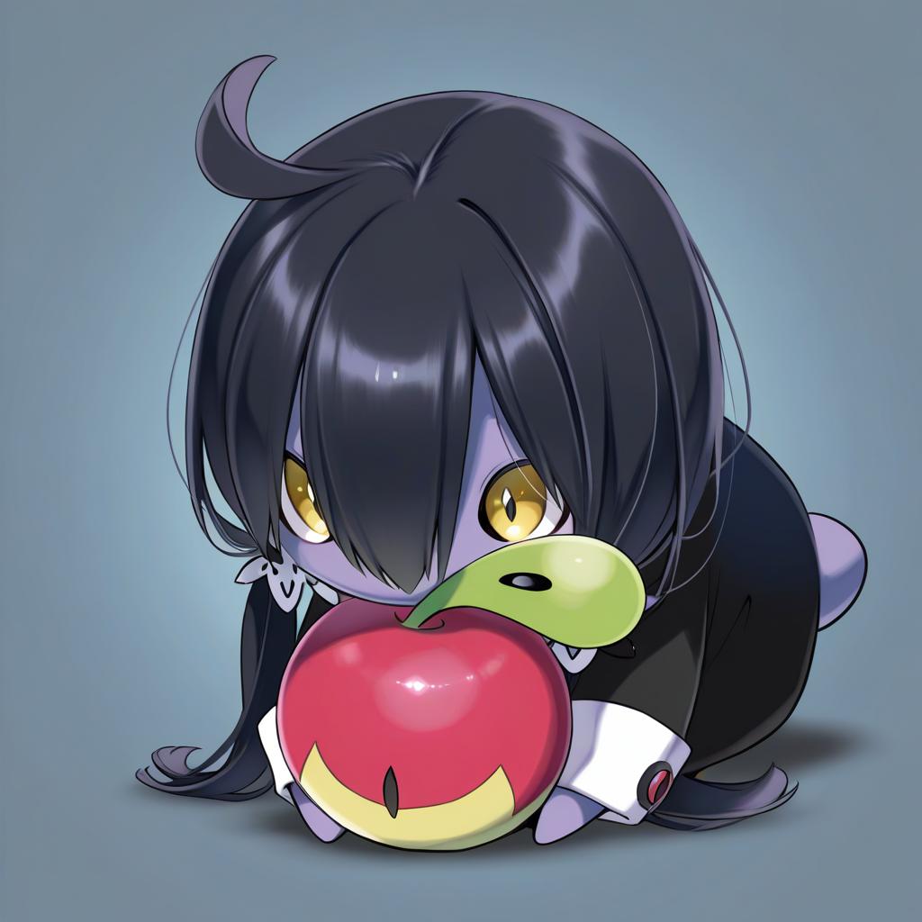 Applin, pokemon, no humans, hair between eyes, yellow eyes, black hair, long sleeves, pokemon (creature), by artist kaamin (mariarose753), illustrious